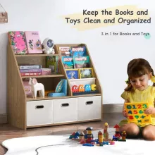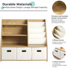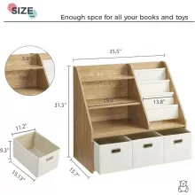 - Ample Storage Space – This versatile organizer features a 3-tier wooden bookshelf, 3 storage bins, and an additional display shelf, providing plenty of room to store books, toys, and small belongings. From books of all sizes to plush animals, dolls, building blocks, and more, this organizer can handle it all.