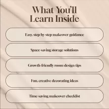 Unlike generic decorating tips, the Kids’ Room Makeover Playbook is designed specifically for kids’ spaces — addressing storage challenges, growth-friendly designs, and creative ways to make a room truly feel like home. It even includes ideas on how to use AI to visualize your design before making changes, giving you confidence every step of the way.