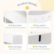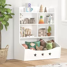 This bookshelf features a practical 3.5-tier design, offering multiple storage options to accommodate books, toys, and supplies. The raised bottom shelf helps keep stored items clean and dust-free, while the combination of open shelves and a bottom bin allows for both display and concealed storage. It’s a perfect addition to any child’s space, helping them develop a habit of organization.