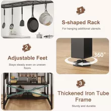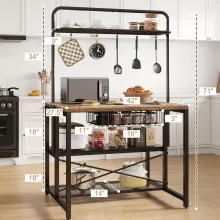 Measuring 42” long, 27.5” wide, and 71” tall, this kitchen island offers ample space for meal prep and storage. The two open shelves provide easy access to kitchen essentials, while the pull-out wire basket keeps frequently used items within reach. Plus, the top shelf is removable, making it perfect for housing appliances like a microwave, toaster, or coffee maker. Five sturdy S-hooks are included for hanging utensils, cookware, and towels, keeping everything organized.