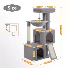 Standing at 41 inches tall, this large cat house features two spacious condos, a comfy hammock, a padded perch, a scratching pad, and a ramp for easy access. The strong and secure design ensures stability as your cats leap and climb from one level to the next. The heavy-duty baseboard and security strap help prevent tipping, making it safe for even the most active cats. Plus, the removable top perch cover makes cleaning a breeze.