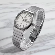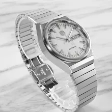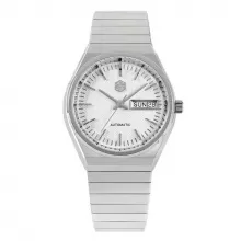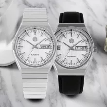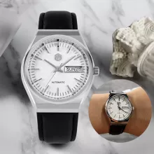 At its core is a reliable automatic mechanical movement, delivering smooth performance powered by your daily motion. The striking white dial features a deep press grid texture and refined trapezoid indices, enhancing the watch’s visual depth. A day and date window at 3 o’clock ensures you stay effortlessly organized, while sapphire crystal glass with anti-reflective coating keeps the view sharp and clear from every angle.