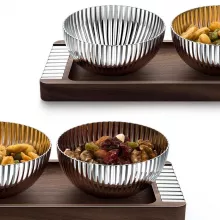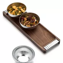Inspired by Scandinavian minimalism, the polished stainless steel Bernadotte-style bowl fits seamlessly into a smooth, recessed walnut wood tray, ensuring every presentation feels curated and elegant. The natural grain of the American walnut adds warmth and richness, while wavy stainless steel handles provide a contemporary finish and easy handling. Perfectly balanced between beauty and practicality, this piece enhances any kitchen, party, or living space.