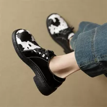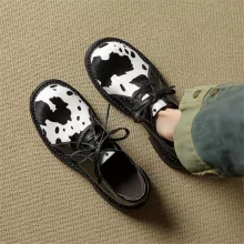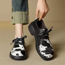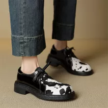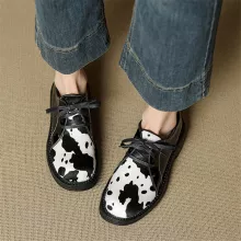 The round toe design offers a timeless silhouette, while the lace-up front adds a sporty touch to this otherwise classic loafer. The upper, made from genuine horsehair, delivers a luxe yet durable finish, enhanced by subtle leopard pattern elements for an extra dose of attitude. Sitting on a stable 4 cm hoof heel with a soft platform, these shoes provide just the right amount of lift without sacrificing comfort.