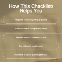 This Mixing Prints Made Simple Checklist is perfect for anyone who wants to elevate their fashion game—whether you’re a casual dresser looking for inspiration, a style enthusiast experimenting with prints, or a professional stylist helping clients mix patterns confidently. It’s also ideal for creative individuals who want to explore AI tools to visualize outfits before making styling decisions.