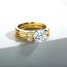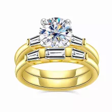 Celebrate your love story with timeless elegance. This exquisite 2 Carat All Moissanite Wedding Ring Set is designed for the woman who loves to sparkle. Made with premium 925 sterling silver and finished in luxurious yellow gold, this engagement and wedding ring set is a breathtaking expression of your commitment. With its stunning round-cut moissanite center stone, this ring offers unmatched brilliance that rivals even the finest diamonds—without the high price tag.