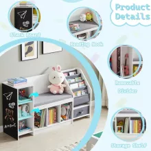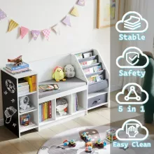 - 5-in-1 Multifunctional Design – Combines a sling bookshelf, toy organizer, cushioned seating, blackboard, and storage drawers in one unit.