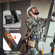 With a smart 7-in-1 convertible design, this folding ladder transforms into multiple shapes including A-frame, M-frame, straight ladder, L-frame, scaffold, and more. It’s equipped with 2 sturdy scaffold platforms, giving you a wider, safer workspace for detailed jobs. The adjustable hinges allow you to lock the ladder securely at 35°, 107°, or 180° for optimal angle and stability.