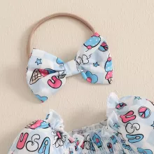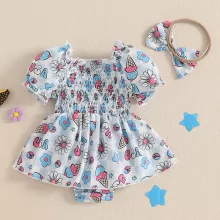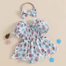 Get your little one ready for a fun-filled Fourth of July with this Newborn Baby Girl Fourth of July Outfit! Featuring a cute puff-sleeve smocked romper, this adorable outfit comes with a matching headband to complete the look. The all-over patriotic print celebrates the holiday in a charming and festive way, making it perfect for family gatherings, parades, or backyard BBQs. Designed for comfort and style, this romper will have your baby looking her best as she celebrates in style.