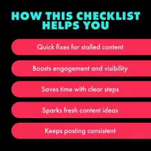 Don’t let creative blocks hold your business back. With Overcoming Content Stalls Like a Pro, you’ll always know exactly what to do when your content stalls. Download your checklist today and start creating with confidence, consistency, and ease!
