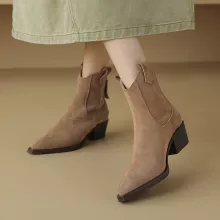 These ankle boots combine classic Chelsea boot style with a trendy pointed toe and wedge heel for a modern twist. Handmade with care and stitched for durability, they bring both fashion and function to your winter wardrobe. The cow suede material and soft plush lining make them ideal for colder months, ensuring warmth without sacrificing style. Perfect for pairing with jeans, skirts, or dresses, they transition effortlessly from day to night.