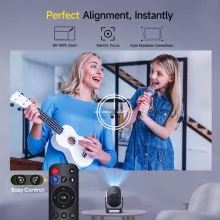 Powered by a quad-core processor and built-in Android 11 system, this projector offers fast performance, smooth streaming, and access to your favorite apps without the need for external devices. Its electronic focusing system allows for sharp, crystal-clear visuals with just the click of a remote. Enjoy flexible viewing thanks to a 90° adjustable stand and comprehensive image correction that adapts to any space or angle.