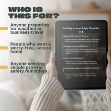 This digital checklist is designed for busy travelers, frequent flyers, and homeowners who want an easy, stress-free way to prepare their home before leaving. Unlike other generic resources, the Pre-Flight Home Safety Checklist combines practical security steps with thoughtful reminders to help you return to a safe, fresh, and worry-free home.