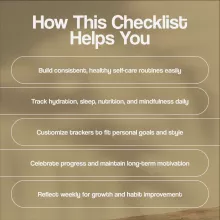 - Pick Your Self-Care Categories: Track hydration, meditation, movement, sleep, healthy meals, digital detox, journaling, and personal pampering.