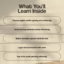 - Chapter 1: The 3-Minute Outfit Mindset – Learn how to overcome decision fatigue, understand the power of a quick routine, and see real-life morning success stories. Includes AI outfit planning prompts for instant inspiration.
