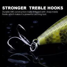 The internal steel balls create a natural rattling sound that grabs the attention of nearby fish while helping you cast farther with better accuracy. Equipped with two ultra-sharp treble hooks, it ensures a strong hold when you hook your catch. The durable ABS plastic body makes this lure tough enough for aggressive strikes from bass, pike, trout, and more.