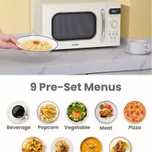 Don’t let the retro look fool you—this microwave is packed with features designed for convenience and efficiency. The large LED digital display, simple control panel, and push-button door release make operation effortless. With 10 power levels, you can precisely control the cooking strength, while the 9 pre-programmed menus let you cook popular items like pizza, frozen veggies, beverages, and dinner plates with just one touch.