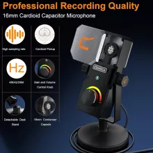 This microphone doesn’t just sound amazing—it looks stunning too. The integrated RGB lighting reacts to your voice dynamics in real time, adding visual flair to your live streams and videos. The 16mm condenser capsule delivers studio-grade audio, while intelligent denoise technology ensures a clean, crisp signal with minimal background interference. Real-time monitoring and one-key mute give you full control during sessions, and the built-in pop filter smooths out plosive sounds for a more polished result.