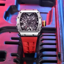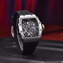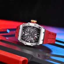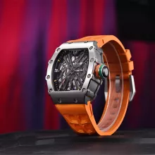 This watch is crafted with a robust 42mm stainless steel case shaped in a distinctive tonneau silhouette. Its skeleton dial reveals the intricate quartz movement inside, bringing mechanical artistry to the forefront. Topped with scratch-resistant sapphire crystal glass, the face remains crisp and clear over time. A thick 0.86-inch rubber strap offers secure, flexible wear whether you’re at the gym, outdoors, or just keeping it casual.
