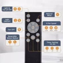 - Remote control with 6 speeds, reversible airflow, and timer options