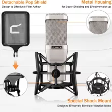 Unlike ordinary mics, this model is crafted for serious creators. The shock mount minimizes vibrations and handling noise, while the detachable pop-shield effectively reduces harsh plosive sounds. A metal body provides superior shielding from electromagnetic interference, ensuring clean audio even in complex setups.