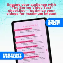 This checklist is perfect for anyone looking to level up their video content. Whether you’re a YouTuber, social media influencer, online marketer, or a small business owner, “The Boring Video Test” will guide you in creating videos that leave a lasting impression. If you’re tired of making videos that fail to hold attention, this product is your solution.