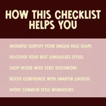 Unlike generic fashion guides, this checklist is straightforward, fun to use, and actionable. It blends expert advice with easy DIY steps—no fashion degree needed. With the exact sunglasses shape for face type recommendations, helpful visuals, and confidence tips, you’ll feel good every step of the way. Plus, it’s printable, so you can use it at home or on the go.