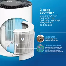 - 2-Stage 360° Filter: Includes a pre-filter for larger particles and a True HEPA filter for fine particulates.