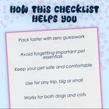 This checklist is perfect for responsible pet owners, frequent travelers, first-time pet parents, and anyone looking to ensure their dog or cat is fully prepared for any kind of outing. If you’ve ever forgotten a favorite toy, medication, or food bowl—you need this!