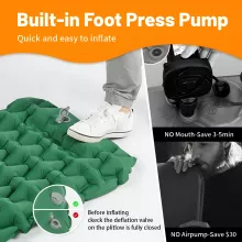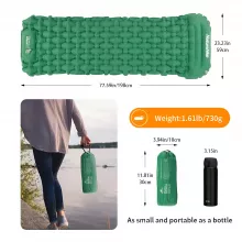 This inflatable mattress is crafted from high-quality 40D nylon with a TPU coating, making it tough, waterproof, and resistant to tears. It measures 78 x 23.2 x 2.6 inches when fully inflated, providing ample space for a good night’s rest. Despite its generous size, it weighs only 1.6 lbs and packs down to a compact 11.8 x 4.3 inches, making it easy to carry in your backpack. The built-in inflator pump allows for quick inflation by simply pressing, so you won’t need to bring a separate pump. With a thickness of about 2.6 inches, it offers excellent cushioning from hard ground while staying lightweight and portable.