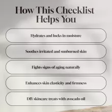 This checklist is not like other skincare guides. It’s practical, easy to follow, and focused entirely on the benefits of avocado oil for skin. The tips inside will help you fully harness the power of avocado oil, from deeply hydrating your skin to offering powerful anti-aging protection. It’s designed for those who want to achieve healthier, more vibrant skin in a natural, affordable way. Whether you’re looking for simple daily skincare routines or DIY treatments, this checklist will be your ultimate guide to glowing skin.