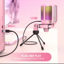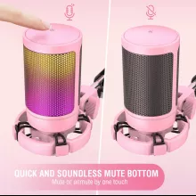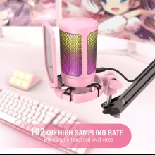 Brighten up your gaming or streaming desk with this gorgeous pink USB condenser microphone. More than just a pretty face, this microphone is designed to capture your voice with clarity and style. With soft RGB lighting that automatically shifts colors, it adds a glowing ambiance that perfectly complements your aesthetic, especially if you’re building out a pink-themed setup. Whether you’re going live on Twitch, recording a podcast, chatting with your Discord crew, or creating video content, this microphone brings vibrant personality and professional-grade performance in one stylish package.