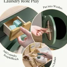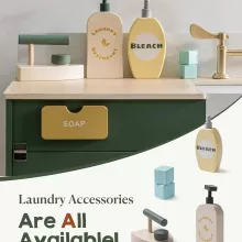 Crafted with high-quality solid wood, this toy washer and dryer set is designed for safety and durability. The set includes a washing machine with a double-door cabinet, a pull-out soap dispenser, and a roller that simulates the sound and feel of a real washer. It comes complete with a wooden bleach bottle, laundry detergent, an iron, and two detergent blocks for a realistic play experience.
