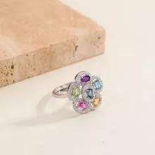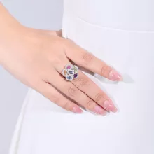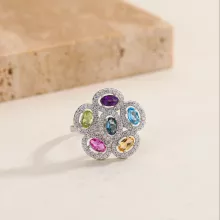 This cocktail ring is not just a piece of jewelry; it’s a statement. The natural gemstones in shades of purple, green, and yellow create a harmonious blend of colors that represent elegance, vitality, and positivity. The prong setting allows each gemstone to shine individually while also enhancing the overall design. Whether you’re dressing up for a fancy dinner or simply want to add a touch of class to your everyday wear, this ring is sure to complement your personal style.