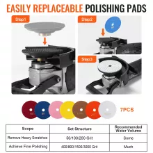 - 7 polishing pads (grits 50, 100, 200, 400, 800, 1500, 3000) for a full range of finishes