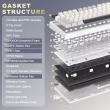 This full-size mechanical keyboard is built for power users and casual gamers alike. Its hot-swappable gasket-mounted design ensures a smooth, quiet typing experience with just the right amount of bounce. From late-night sessions to on-the-go productivity, this keyboard adapts to your lifestyle with tri-mode connectivity—Bluetooth, 2.4GHz wireless, and Type-C wired options. Pair with multiple devices, switch between them seamlessly, and keep typing without missing a beat.