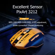 Equipped with a high-performance PIXART 3212 chip, the mouse delivers ultra-precise tracking and ultra-low power consumption. The adjustable five-level DPI (800 to 2400) ensures smooth performance across different surfaces and tasks—whether you’re browsing, designing, or gaming.