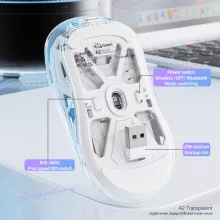 This wireless mouse combines functional design with serious performance. Its dual wireless modes (Bluetooth and 2.4GHz) give you flexibility across devices, while the vivid RGB base lighting — with over 16.8 million color combinations — sets the tone for any gaming environment. The transparent outer shell enhances the lighting for a futuristic look, and the built-in digital screen keeps battery levels in clear view. With 5-step DPI adjustment up to 4000 DPI, you can tailor your precision to match any task — from fast-paced battles to precise photo edits.