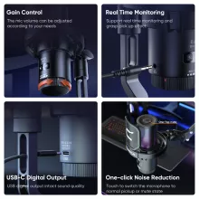 This mic isn’t just built to sound good — it looks amazing too. With four dynamic RGB light effects, your setup will shine with personality and style. A built-in sound card makes it plug-and-play ready, so you can start recording right away without any software or drivers. From whisper-quiet narration to high-energy commentary, you’re always in control with intuitive features like gain adjustment, real-time monitoring, one-key mute, and instant noise cancellation.